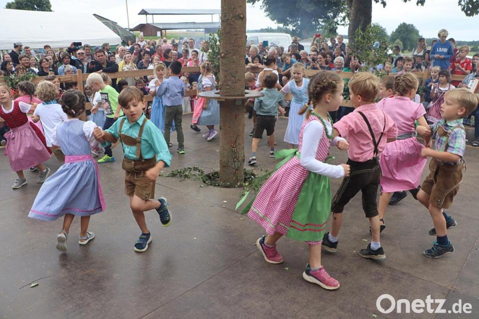 In schmucken Dirndln und Lederhosen traten die Vorschulkinder der Kindertageseinrichtung in Edelsfeld am Montag beim Baumaustanzen den „Großen“ in nichts nach. Lautstark sangen sie die einstudierten Lieder und legten eine kesse Sohle auf das Tanzparkett. Nachdem der Blumenstrauß einige Runden gedreht hatte, wurde auch hier mit Ronja Schwinger und Toni Rosner ein Oberkirwapaar auserkoren.
