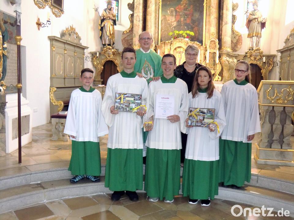 Der Geistliche dankte für das langjährige Engagement in der Ministrantengruppe und in der Pfarrei. Er richtete ein "Vergelt's Gott" an sie und wünschte alles Gute für den zukünftigen Lebensweg. "Möge Gottes Segen euch weiterhin begleiten." Mit der Überreichung einer Urkunde und eines Bronzekreuzes verabschiedete der Seelsorger die drei Ministranten. Auch Mesnerin Renate Pflug sprach ihnen Dank und Anerkennung aus und überreichte eine Fotocollage mit Erinnerungen an die Ministrantenzeit. Zum Schluss brachten auch die Kirchenbesucher ihren Dank mit ausgiebigem Beifall zum Ausdruck.