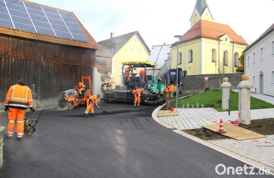 Wenn eine solche Teerkolonne anrückt, dann wird für Außenstehende hektische Betriebsamkeit sichtbar. Schließlich muss der heiße Asphalt vor dem Abkühlen verarbeitet sein. Für das Team der Firma Huber war es eine routinemäßige Tätigkeit, als es im Mühlweg die Deckschicht einbaute.