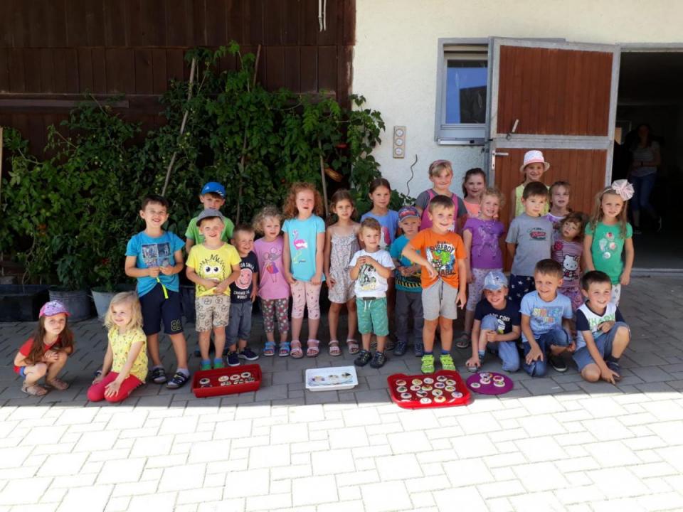 Es wurden 33 Kinder mit Mutti oder Papi in der Hofstelle des Anwesens Meier in der Schulstraße begrüßt. Zuerst mussten die Kinder den Salzteig bearbeiten, ausrollen und die Formen ausstechen. Dann wurden die Mandalas überwiegend mit Blüten, aber auch mit Früchten von Sträuchern und Getreide geschmückt und mit Aufhängern versehen. Aus den restlichen Blüten banden die Kinder Blumensträußchen.