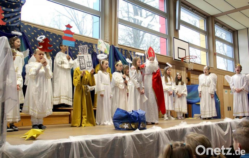 Zur Einleitung spielten Theresa Mathes und Florian Kiener als Solisten jeweils auf dem Keyboard sowie Eva-Marie Raab und Jonas Kiener als Gitarrenduo vorweihnachtliche Weisen. Mit dem Lied „Eine Kerze leuchtet weit“ leiteten die Kinder der 1. und 2. Klasse über zur Uraufführung des Musicals „Patschelchens Weihnachtsabenteuer“.