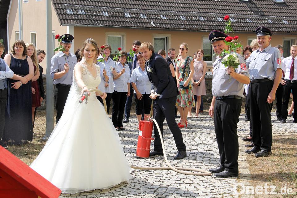 Seine Feuerwehrkameraden wollten natürlich wissen, wie gut das Zusammenspiel zwischen dem jungen Paar schon funktioniert und stellten ihnen das Zielspritzen zur Aufgabe. Daniel sorgte an der Kübelspritze für ordentlichen Druck und Barbara erwies sich als sehr treffsicher. Unter dem Beifall der Zuschauer meisterten sie diese Aufgabe vortrefflich. Von beiden Vereinen erhielten sie ein Präsent und von allen Spalierteilnehmern eine Rose, so dass sich das Brautpaar auch noch an einem schönen Rosenstrauß erfreuen konnte.