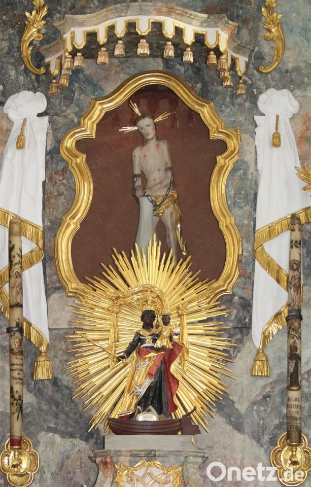 Vor einer runden Öffnung im obersten Teil des Altars befindet sich das "Auge der Vorsehung", auch "Allsehendes Auge" oder "Auge Gottes" genannt. Es ist ein Symbol, welches die Menschen an die ewige Wachsamkeit Gottes erinnern soll. Dargestellt wird es als ein von einem Strahlenkranz umgebenes Auge, von einem Dreieck umschlossen, das auf die Trinität, die Dreifaltigkeit Gottes verweist. Der lichtdurchflutete Strahlenkranz bringt dieses Symbol noch stärker zur Geltung. Der marmorierte Rokokoaltar mit seinen vielfältigen Engelsfiguren und reichhaltigen Schmuckelementen ist in seiner gesamten Erscheinung von beeindruckender Schönheit.