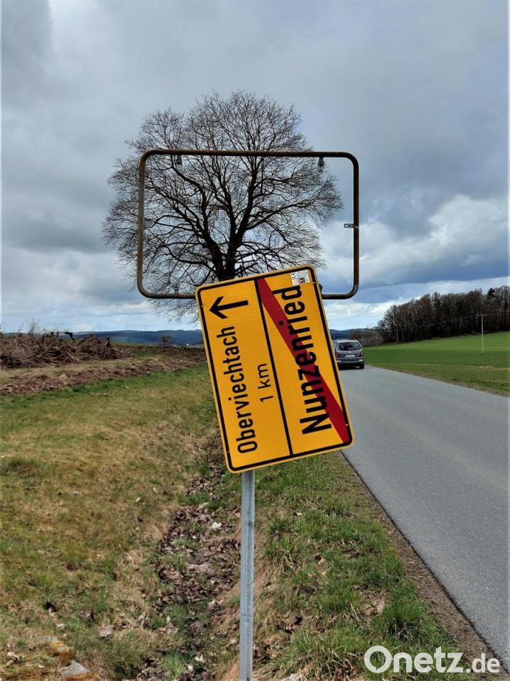 Das Ortsschild von Nunzenried hängt schief, mittlerweile wurde es ganz entfernt. Die starken Frühjahrsstürme der zurückliegenden Tage haben in der hochgelegenen Ortschaft besondere Kräfte entwickelt.
