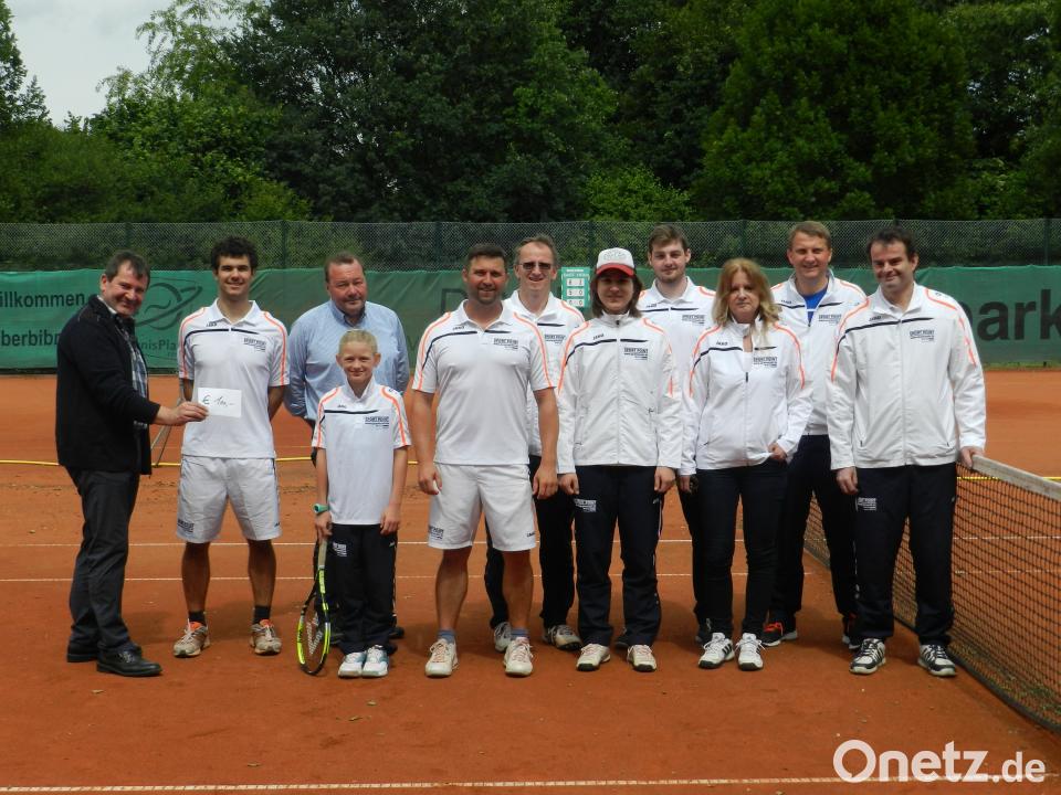 Unterstützung von vielen Seiten erfahren die Tennisfreunde Oberbibrach anlässlich ihres Jubiläumskirchweihturnieres. Gemeinderat Alexander Goller (links) und CSU-Vorsitzender Peter Stickling (Dritter von links) etwa übergaben dem von Norbert Schecklmann (rechts) geführten Verein eine 100-Euro-Spende.