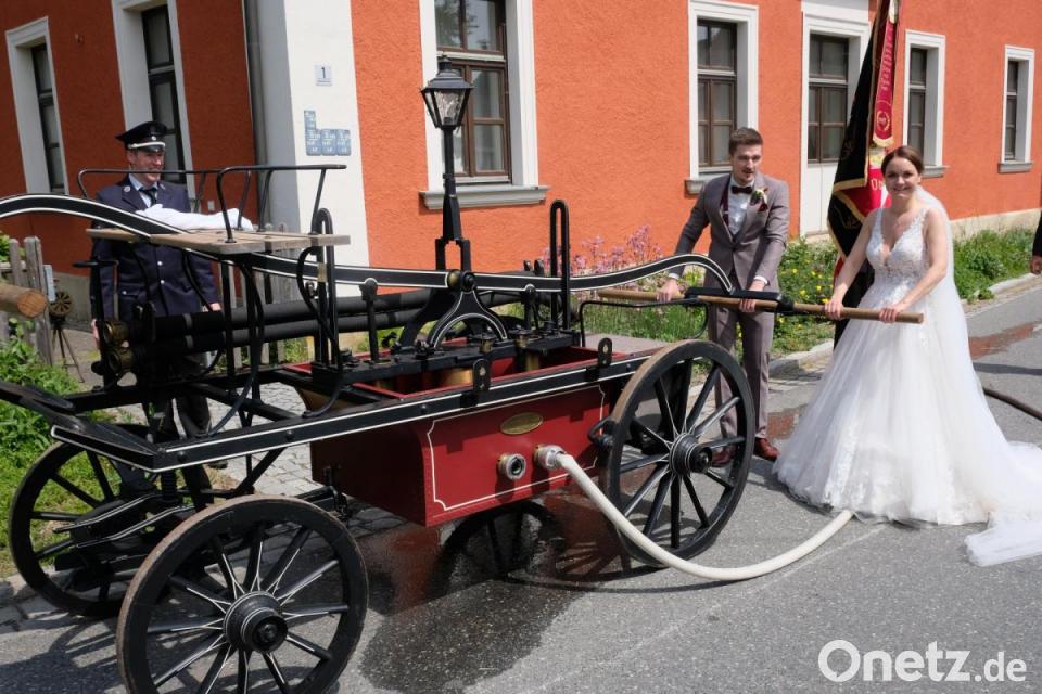 Damit nicht genug, riefen die Feuerwehrkollegen zum Löscheinsatz. Während der Bräutigam an der Uralt-Wasserspritze der Wehr kräftig pumpen musste, zeigte die Braut ihr Geschick beim Brandeinsatz. Auch die Landjugend-Gruppen aus Oberbibrach und Burkhardsreuth stellten dem Paar knifflige Aufgaben. Jungspunde der Firma Rogers überprüften das handwerkliche Geschick des Bräutigams. Nach dem Öffnen einer Schatzkiste offenbarte sich den Brautleuten eine Batterie flüssiger Geschenke. "Gefunkt" hat es bei Manuel und Julia bei einem Backofenfest in Oberbibrach. In unmittelbarer Nachbarschaft fand im Schützenhaus St. Sebastian auch die Hochzeitsfeier statt.