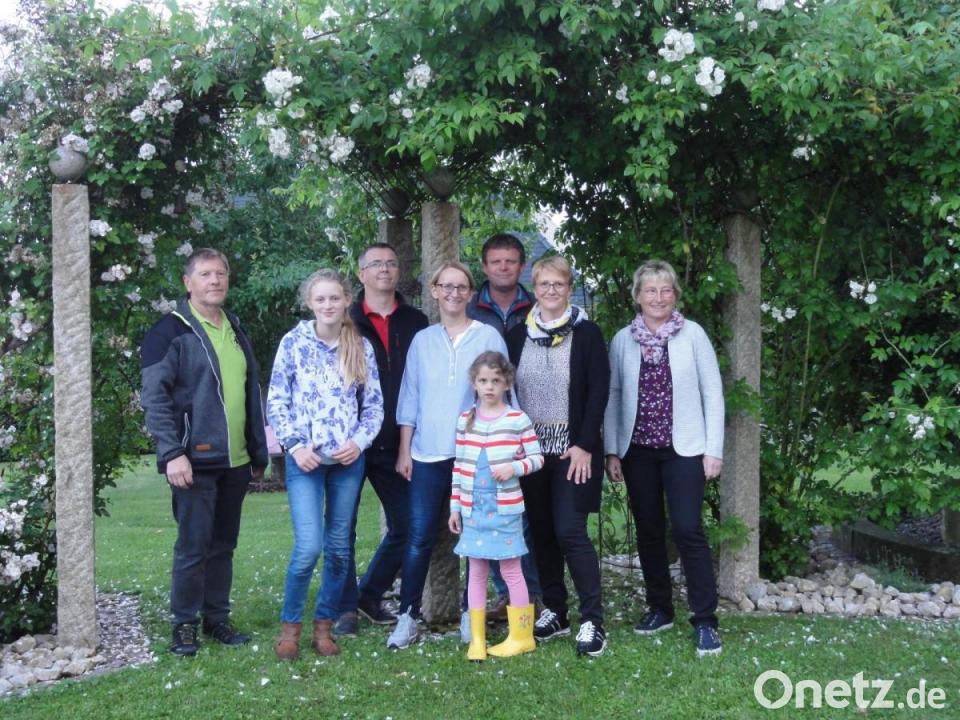 Von der Terrasse aus hat man einen wunderschönen Blick über das nach Süden leicht abfallende Gartengelände und darüber hinaus. Viele Pflanzflächen mit Rosen, Stauden und kleine Sträucher unterbrechen die Rasenfläche. Nach dem Gang durch die sehenswerten Gartenparadiese luden die Gastgeber die sichtlich beeindruckten Gäste zu einem gemütlichen Plausch ein.