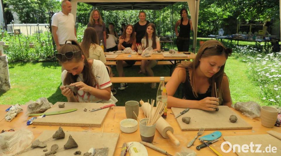 Unter schattenspendenden Pavillons durften die Schülerinnen gleich loslegen. Beim Arbeiten mit Holz leitete sie Manfred Hutzler in seiner Werkstatt beim Drechseln, Sägen, Bohren und Schleifen an. Wer mochte, konnte mit Ton (Paperclay) verschiedene Formen, Figuren, Tiere, Schälchen, Kugeln, Skulpturen, Pilze, Rosen und eine Vogeltränke formen. Auch Verzierungen mit Metall waren möglich. Der Kreativität und dem Einfallsreichtum waren dabei keine Grenzen gesetzt. Die Mädchen waren mit Feuereifer bei der Sache. Wer Hilfe brauchte oder einen Rat wollte, konnte sich an „MaRe“ (Manfred und Renate) wenden. Spontan entschlossen sie sich, Nagelmenschen als Abschiedsgeschenk für eine Lehrerin zu fertigen.