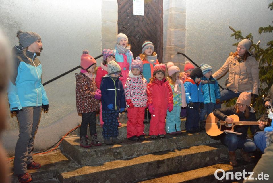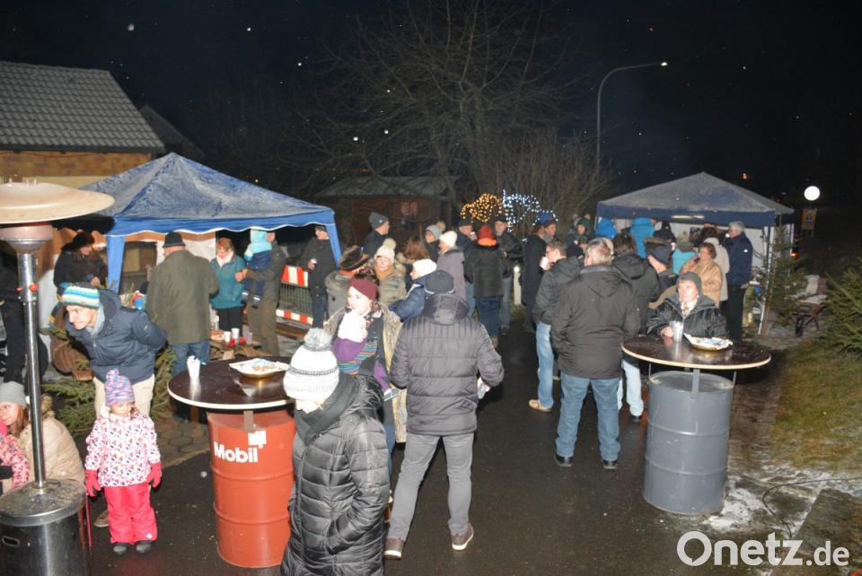 Die Dorfgemeinschaft traf sich anschließend vor der Kapelle mit ihren Gästen. Bei frostigen Temperaturen und wenigen kleinen Schneeflocken feierten alle an den hell brennenden Feuerkörben und wärmten sich unter den aufgestellten Wärmepilzen auf der während der Veranstaltung für den Verkehr gesperrten Ortsstraße. Die neu gegründete Kindergesangsgruppe "Ichtys" unterhielt mit besinnlichen Liedern, wofür die Mädchen und Buben im Alter von vier bis zehn Jahren unter der Leitung von Bianca Greger, Susanne Griener, Marina Neumüller und Stefanie Scherer großen Applaus erhielten. Die Dorfgemeinschaft bewirtete die Besucher mit Glühwein, Lebkuchen und deftigen Speisen vom Grill.