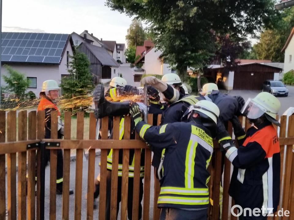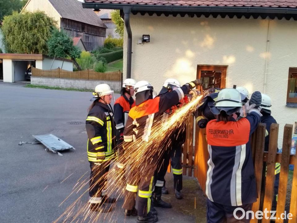 Die Oberlinder Feuerwehrkräfte haben als Übungsbeispiel angenommen, dass ein Bauarbeiter von einem Gerüst gestürzt war und ausgerechnet auf einem spitzen Metallzaun landete. Dabei bohrten sich Eisenteile durch seinen Körper. Die Feuerwehrleute berieten, welche Vorgehensweise und vor allem welche Geräte zur Rettung eingesetzt werden können. Das Ganze musste möglichst schonend und vor allem schnell erfolgen, ohne dass sich der Fremdkörper hin und her bewegt oder gar aus dem Verletzten herausgezogen wird. „Der Fremdkörper wirkt wie ein Wundverschluss und verhindert, dass Blut in großen Mengen austritt“, erklärte Kommandant Markus Kindl. Die Metallstange darf deshalb erst im Krankenhaus fachgerecht entfernt werden.
