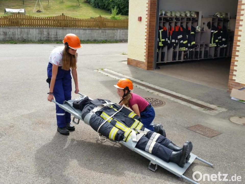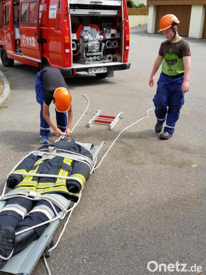 Die Feuerwehranwärter verbrachten zwölf Stunden ununterbrochen im Gerätehaus und übten den Umgang mit den verschiedenen Geräten. Alle Betreuer setzten auf eine Mischung zwischen Theorie und Praxis. Freizeit und Gerätehauspflege gehörten dazu. Eine der ersten Aufgaben war der Umgang mit der Steckleiter, deren Zusammenbau und die Einsatzmöglichkeit. Davor stand die Gerätekunde. "Die Jugendlichen müssen von Beginn an lernen, wo die einzelnen Gerätschaften im Fahrzeug verstaut sind. Außerdem ist es wichtig, dass sie deren richtige Anwendung im Einsatz kennenlernen und auch erklären können", betonte Kindl. Deswegen stellte der Kommandant den Nachwuchstrupps die Aufgabe, die ausgewählten Gerätschaften innerhalb von 20 Sekunden in die Felder "Entnahme, Fortleitung, Abgabe sowie Kupplungen und Zubehör" einzuordnen. Wenn eine Person im Notfall nicht durch ein Treppenhaus oder eine Drehleiter nach unten gebracht werden kann, muss der Verletzte zusätzlich mit einer Feuerwehrleine auf der Krankentrage gesichert werden. Mit Hilfe eines zweisprossigen Einsteckteils simulierten die Helfer eine Leiter und die Feuerwehranwärter übten in mehreren Durchgängen ausführlich das richtige Anlegen der einzelnen Knoten, die in Fleisch und Blut übergehen müssen. Die Feuerwehr leistet bei ihren Einsätzen oftmals Erste Hilfe und überbrückt die Zeit bis zum Eintreffen der Rettungskräfte. Deswegen legen die Ausbilder großen Wert auf die Ausbildung in Erster Hilfe. In diesem Zusammenhang wurde der Einsatz eines Defibrillator erklärt.