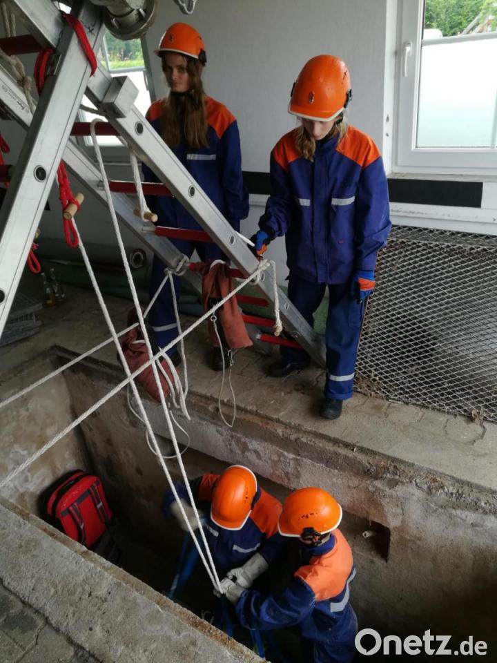 Dann ging's los: Ein Mann war in eine Montagegrube gestürzt. Die Rettung gestaltete sich schwierig, da sehr beengte Platzverhältnisse im Umfeld des Verunglückten herrschten. Ein Trupp stieg mit einem Notfallrucksack über die Steckleiter nach unten, untersuchte die Lage und gab Informationen an den Gruppenführer weiter. Dieser entschied sich aufgrund der Meldung für die Rettung per Krankentrage. Mit einer behelfsmäßig zusammengebauten Bockleiter aus Steckleiterteilen und einem Standrohr wurde ein Flaschenzug errichtet mit dem der Verletzte schließlich aus der Grube gerettet werden konnte. Geschick und Knotenkunde waren hier gefragt und das bisher Erlernte konnte abgerufen werden.