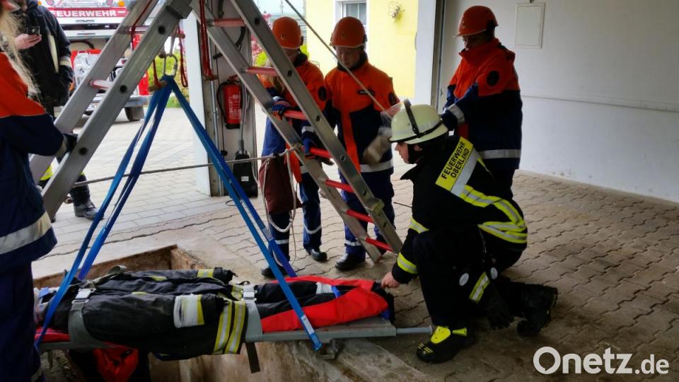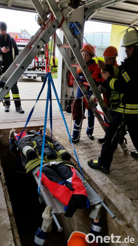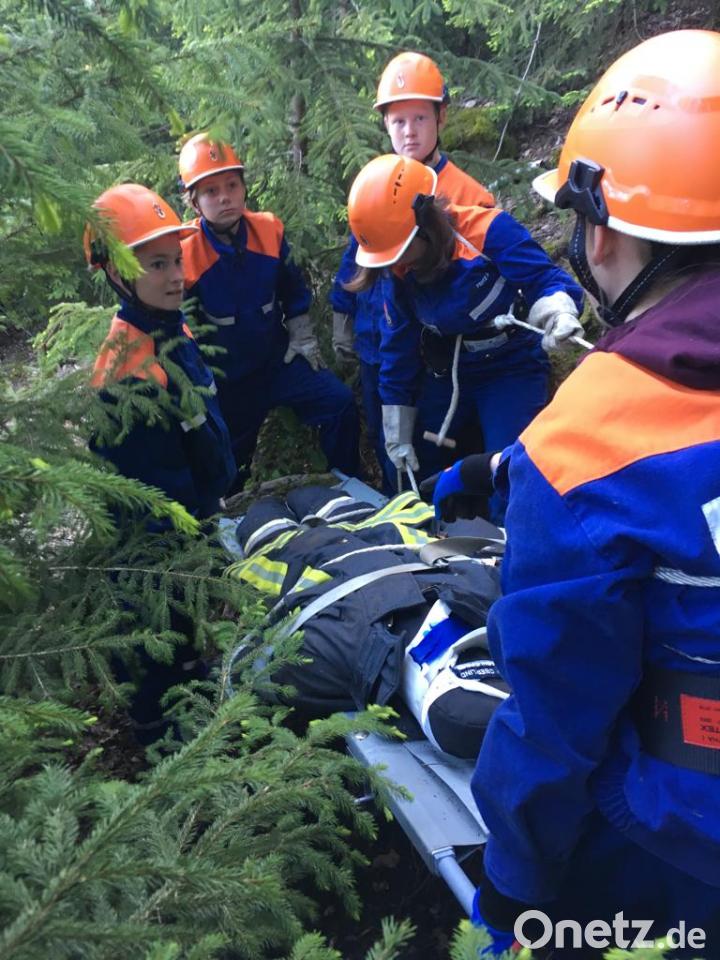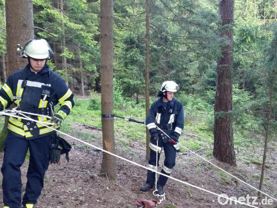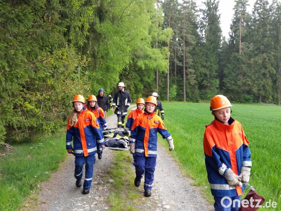 Doch schon traf die nächste Alarmierung im Feuerwehrhaus ein: Eine Person war am Riesensessel oberhalb des Pfreimdtals abgestürzt. Ein Spaziergänger alarmierte zwar die Feuerwehr, allerdings konnte er nicht genau beschreiben, wie man zu der Unfallstelle kam und wo er sich exakt befand. Deswegen machte sich sofort ein Trupp auf dem Weg, die verletzte Person zu finden. Nachdem die Einsatzkräfte den Verunfallten mit seinem Ersthelfer lokalisiert hatten, stiegen zwei Trupps nach unten, um Details in Erfahrung zu bringen, den Verletzten zu versorgen und anschließend zu retten. Oberste Priorität in einem steilen Gelände nimmt die Eigensicherung der Rettungskräfte ein. Deswegen legten die Lehrgangsleiter bei dieser Übung ein besonderes Augenmerk auf die dazu notwendigen Knoten unter Zuhilfenahme des Feuerwehrgurts und der Leinen, die zugleich genau erklärt und geübt wurden. Viele Aktive der Wehr unterstützten die Jugendlichen bei diesem Vorgang.