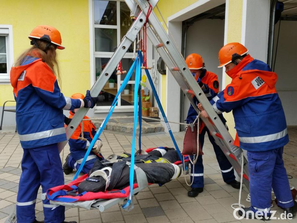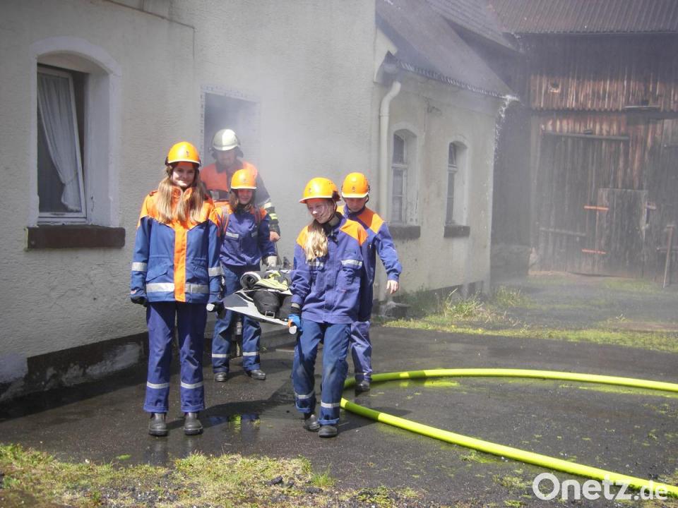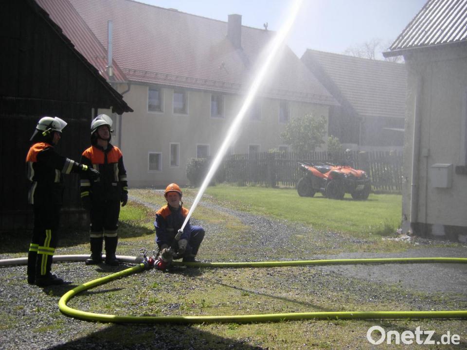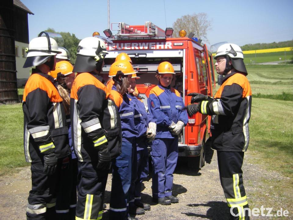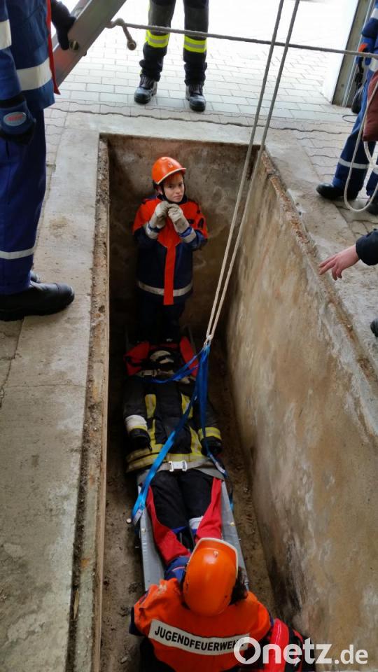 Außerdem sollten die Nachwuchskräfte Kommunikation im Team lernen. „Feuerwehrleute sind absolute Teamspieler. Keiner steht für sich allein und Probleme werden immer gemeinsam gelöst“, appellierte der Kommandant an seine Mannschaft. Durch Geschicklichkeitsspiele wurde diese Feststellung vertieft. Dann war ein Arbeiter ist in eine Montagegrube gestürzt. Die Rettung gestaltete sich besonders schwierig, da in der Tiefe sehr beengte Verhältnisse herrschten. Ein Trupp stieg mit dem Notfallrucksack über die Steckleiter nach unten, untersuchte die Lage und gab seine gesammelten Informationen an den Gruppenführer weiter. Dieser entschied sich dann auf Grund der erhaltenen Meldung für die Rettung mittels Krankentrage. Mit Hilfe einer behelfsmäßig zusammengebauten Bockleiter aus Steckleiterteilen und Standrohr wurde ein einfacher Flaschenzug errichtet, mit dem der Verletzte schließlich aus der Grube gerettet werden konnte. Geschick und Knotenkunde waren bei diesem Rettungspart ebenfalls wieder gefragt. Nach einer Übungsfahrt mit dem Einsatzwagen brannte plötzlich ein Gartenhäuschen in Oberlind. Nach dem Eintreffen an der Einsatzstelle bauten die Jugendlichen eine Wasserversorgung auf und bekämpften den Brand, den sie schnell unter Kontrolle brachten. Nach dem Mittagessen wurde auch der theoretischen Ausbildung genügend Platz eingeräumt. Besprochen wurde das richtige Verhalten bei Verkehrsunfällen oder die Absicherung von Einsatzstellen. Der Eigenschutz dürfe nie vergessen werden, deshalb müssten sich die Einsatzkräfte ordentlich mit Warngeräten ausrüsten.