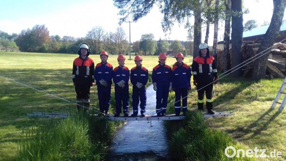 Nachdem die Jugendlichen angekommen waren, richtete sich jeder im Unterrichtsraum seinen Schlafplatz her. Danach erfolgte eine kurze Einweisung zum Ablauf der nächsten 24 Stunden. Gelehrt wurde der Umgang mit der Steckleiter, die richtige Entnahme vom Löschfahrzeug und der Zusammenbau und die Einsatzmöglichkeiten. Kaum war dieser Punkt abgearbeitet war eine Katze auf einem Anwesen in Unterlind auf einen Baum geflüchtet und kam nicht mehr herunter. Somit war der erste Einsatz bereits vorprogrammiert, an dem sich die Feuerwehrkräfte testen durften. Präzision verlangte die Geschicklichkeitsübung mit dem Bau einer Hängebrücke mit Steckleiterteilen und Leinen über den Leraubach. Zwischendurch wartete ein Abendessen auf die tatkräftige Mannschaft.