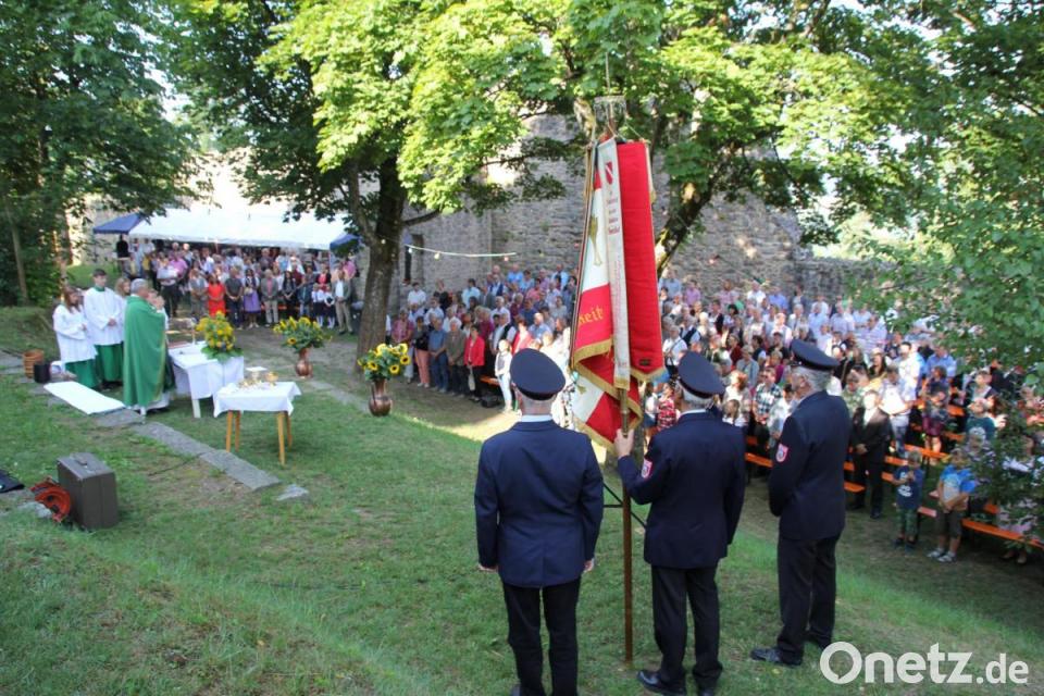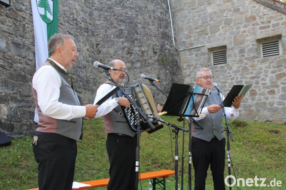 Stadtpfarrer und Dekan Alfons Kaufmann ermunterte die Gläubigen, darüber nachzudenken, in wie vielen Situationen des Lebens wir hautnah spüren, dass Gott unter uns ist und was er uns alles nicht zuletzt auch mit unserer schönen Heimat, schenkt. Pfarrer Kaufmann erinnerte dabei an den in diesen Tagen viel zu früh verstorbenen Reinhard Welnhofer, der als einer der "Vöichtacher Boum" diesen Festgottesdienst auf der Burg oft gesanglich mitgestaltet hatte. Der "Murachtaler Dreigesang" brachte mit seinem am Ende gesungenen "Murachlied" die Schönheit unserer Heimat zum Ausdruck und bescheinigte dem Herrgott, dass ihm das Murachtal und die Oberpfalz besonders gut gelungen sind. Für ihre Darbietungen bekamen die drei Sänger von den Gottesdienstbesuchern viel Beifall. Nach dem Festgottesdienst spielten die "Bierseyder" zu Kaffee und Kuchen oder zum Weißwurstfrühstück zünftig auf, und vielen Gästen gefiel die Burghofatmosphäre so gut, dass sie gleich über die Mittageszeit dablieben. Neben den Grillspezialitäten konnte man sich schon die ersten Steckerlfische schmecken lassen.