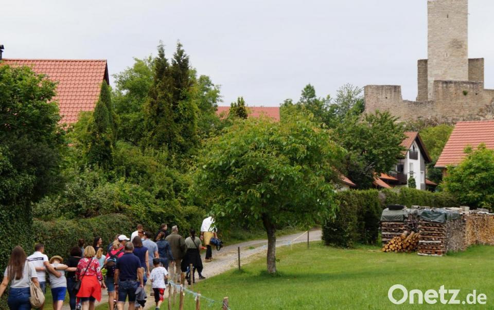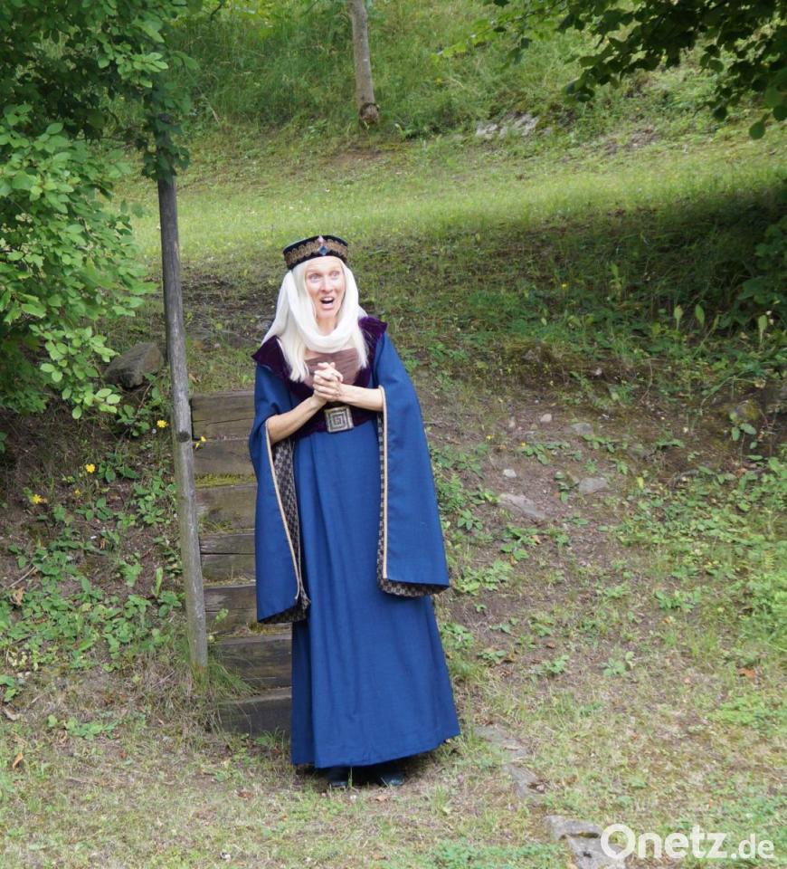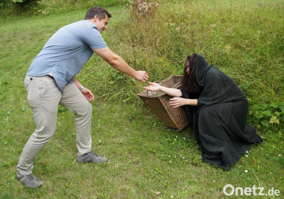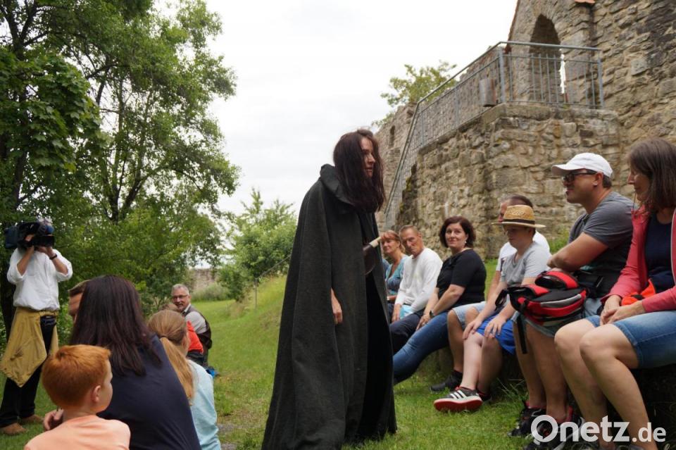 Auf dem Weg in Richtung Nottersdorf saß eine „Bettlerin“ (Petra Sommer-Stark) und spielte mühsam Flöte. Bürgermeister Rudolf Teplitzky erbarmte sich ihrer und gab ihr Almosen. „Zwerge und Riesen kommen in Oberpfälzer Sagen oft vor, sie sind personifizierte Urkräfte“, erklärte „Reiseführer“ Wein. Bei Franz Xaver Schönwerth seien Zwerge Abbilder der Kelten. Die Sage von einem Mann, der wegen angeblichen Klauens von drei Äpfeln an den Schweif eines Pferdes gebunden und rund um die Burg geschleift wurde, wurde dramatisch von Bernhard Neumann in einer Szene thematisiert.