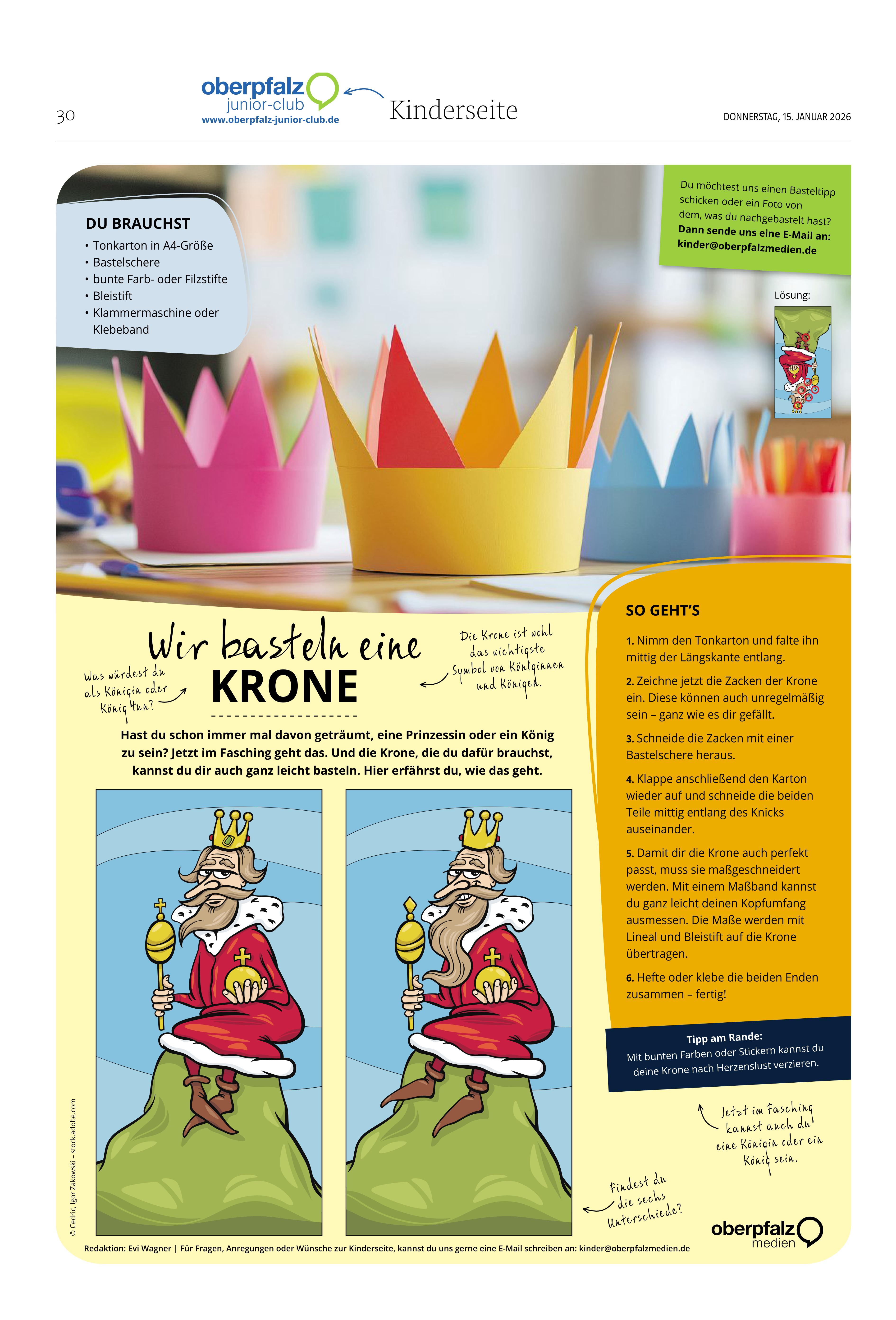 Seit Dezember 2024 gibt es bei Oberpfalz-Medien unseren neuen Junior-Club, der speziell für junge Leserinnen und Leser im Alter von 6 bis 12 Jahren ins Leben gerufen wurde. Der Club bietet eine bunte Mischung aus Veranstaltungstipps, kreativen Bastelanleitungen, spannenden Rätseln, Ausmalbildern sowie Rezepten und interessanten Wissensthemen - und das alles kostenlos.
