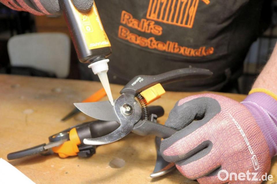 Abschließend werden die Metallflächen und beweglichen Teile mit einem speziellen Pflegeöl, Nähmaschinenöl oder Multifunktionsöl behandelt und die Schere wieder zusammengebaut. Dabei stellen Sie das Spiel so ein, dass sich die Schere leicht öffnet, aber die Klinge und Gegenklinge im geschlossenen Zustand ohne Spalt aneinander liegen.