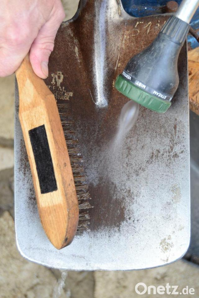 Durch abschließendes Ölen der Metallflächen wird während der Einlagerung bei hoher Luftfeuchtigkeit die Bildung von Flugrost verhindert. Spezielle Sprühöle gibt es in Baumärkten und im Gartengeräte-Fachhandel. Alternativ kann auf diese „groben“ Werkzeuge auch ein preiswertes dünnflüssiges Pflanzenöl mit einem Lappen aufgetragen werden, wie Sonnenblumen- oder Sojaöl.