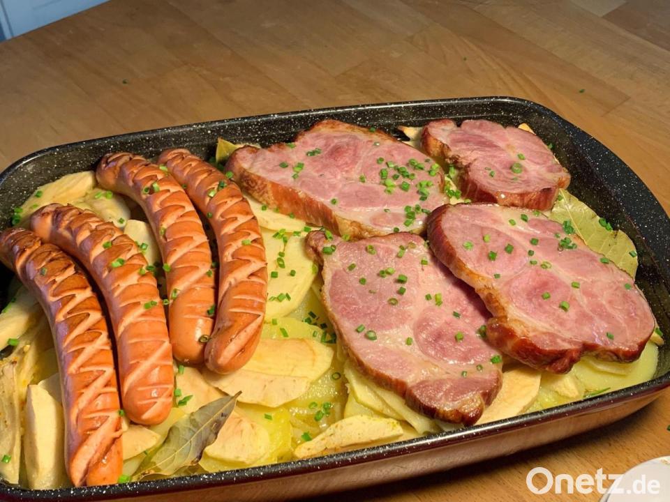 Die Würste einritzen und mit den Kasselerkoteletts auf den Auflauf legen. Mit flüssiger Butter bestreichen, die Form verschließen und in den Backofen schieben.