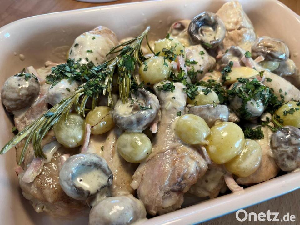 Die Schalotten und den Knoblauch abziehen und mit den Weintrauben, dem Dörrfleisch und den Champignons zu den Hähnchenteilen geben. Mit dem Weinbrand flambieren.