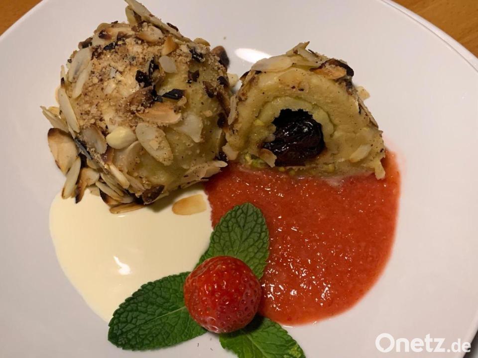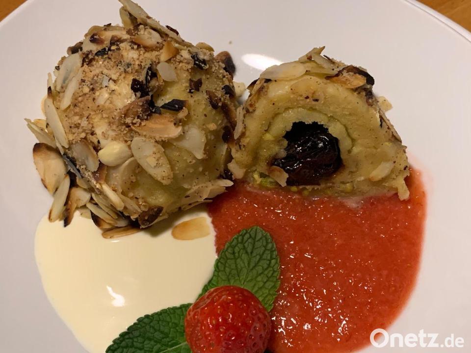 Je einen ganzen und einen halbierten Knödel auf einem weißen Teller mit Soße und Erdbeermus anrichten. Mit Pfefferminzblättchen und Puderzucker verzieren.
