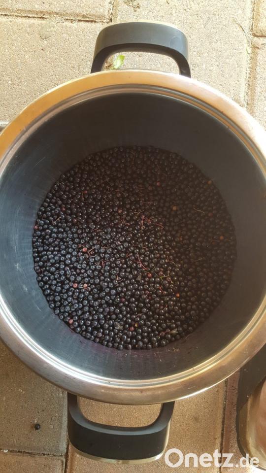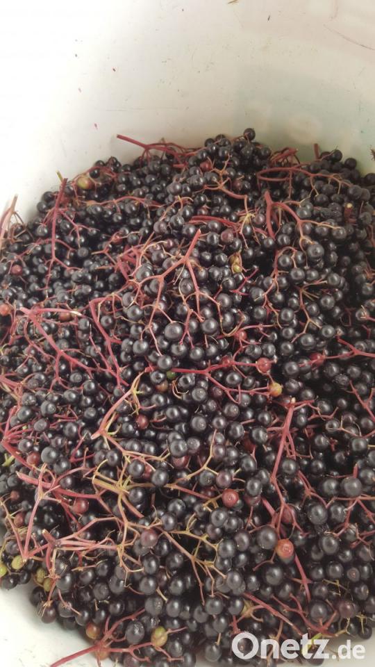 (ils) Etwa einen halben 10-Liter-Eimer reife Dolden des Holunderbusches nimmt Ilse Hauer und sucht sich einen gemütlichen Ort. "Jetzt beginnt die Arbeit, die nicht lustig ist." Mit einem U-förmigen Kleiderbügel streift die Obersdorferin die Beeren von den Dolden ab. Wenn das geschafft ist, geht es ans Waschen der Früchte und dann ans Einkochen.