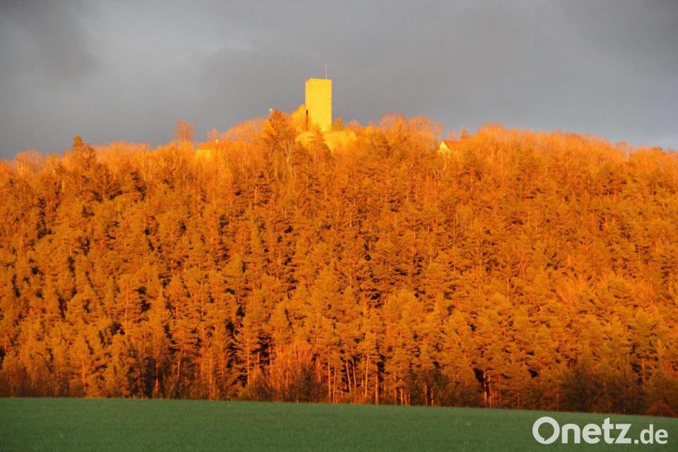 Ein sehr ungewöhnliches Farbenspiel konnte Freitagabend vielerorts beobachtet werden. Nachdem der letzte Schauer abgezogen war, klarte der Himmel auf und gab der Abendsonne die Chance, den Umschwung zu freundlicherem Wetter anzukündigen. Die Luft war rein und so zauberten die Sonnenstrahlen ein äußerst seltenes Farbenspiel an den Berg mit der Burg Haus Murach. Während das Grün der im Schatten liegenden frischen Saat und der dunkle Himmel ihre Farben behielten, erschien der Wald in einer derart intensiven rötlichen Färbung, dass das Grün der Bäume kaum noch zu erkennen war. Die Abgrenzung der Farben in den drei Bildabschnitten ist extrem, keine weichen Übergänge. Es war ein beeindruckendes Naturschauspiel, wie es von Menschenhand nicht annähernd zu schaffen wäre.
