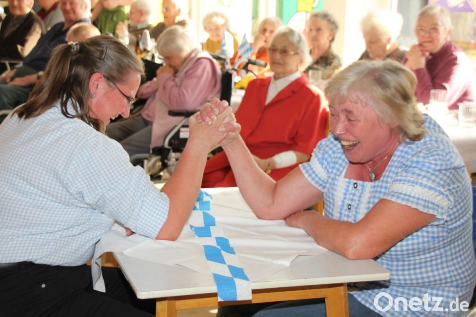 Viel Erheiterung brachten auch die bayerischen Bierzelt-Kraftsportdisziplinen Armdrücken, Fingerhakeln und Masskrugstemmen, bei denen einige Damen im wahrsten Sinne des Wortes Kraft und Ausdauer zeigten, wofür es von den Senioren natürlich Sonderapplaus gab. Nach dem tollen Auftritt von "Maria und Margot Hellwig" musste aber auch wieder Schluss mit dem lustigen Treiben sein und so mancher Senior mag an diesem Tag im Walzerschritt auf sein Bett zugegangen sein und vielleicht sogar ein wenig von diesem schönen Nachmittag geträumt haben.