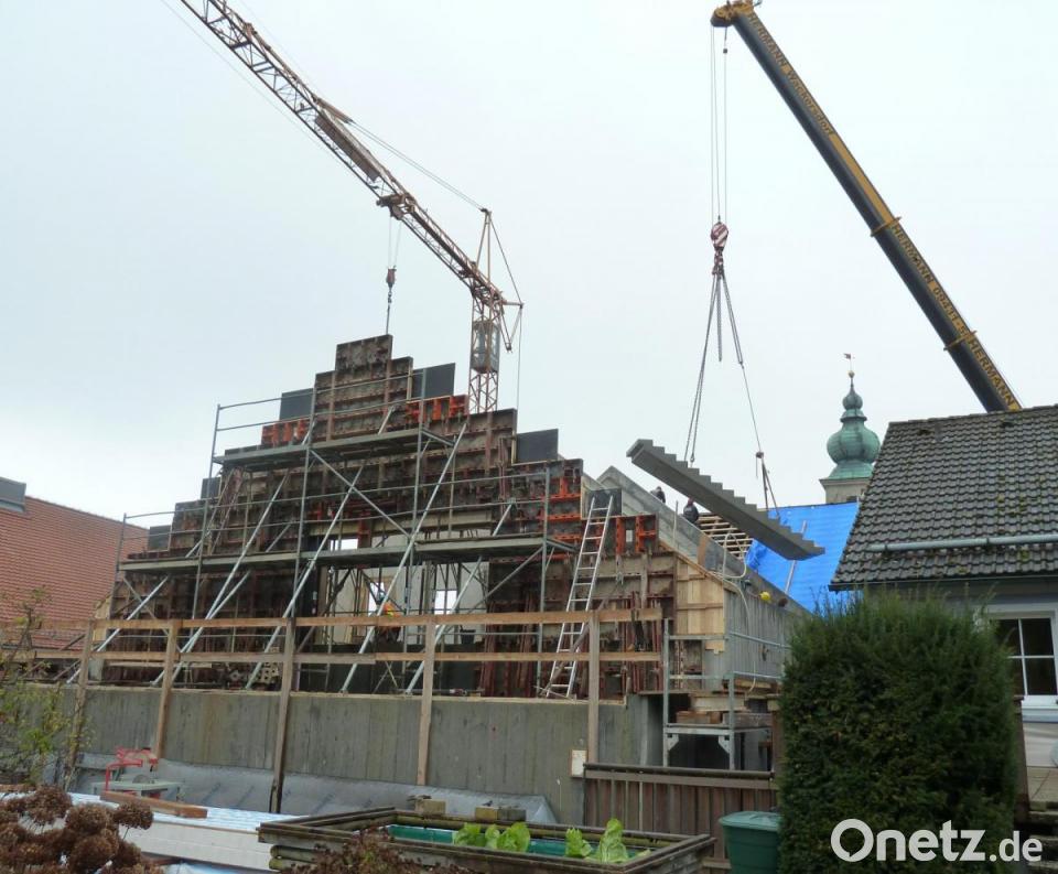 Eine kurzzeitige Straßensperrung war aus Sicherheitsgründen am Dienstag für den Mühlweg angeordnet: Am Kranausleger baumelten die schweren Beton-Treppenteile, die über das noch offene Dach des künftigen Stadtarchivs eingesetzt wurden. Voraussichtlich ab 21. November kann die Firma Streck mit den Zimmererarbeiten starten. Das Leimholz dafür wurde bereits angeliefert. Doch zunächst ist noch die Baufirma Baumer gefordert: Ende dieser Woche wird der vierte Giebel (Außengiebel in Richtung Marktweiher) betoniert, und auch noch weitere kleinere Betonbauarbeiten stehen an. „Am nächsten Dienstag kommen die Gerüstbauer“, informiert der geschäftsleitender Beamte Wolfgang Ruhland. Ziel sei es, dass der Neubau bis Weihnachten winterfest ist.