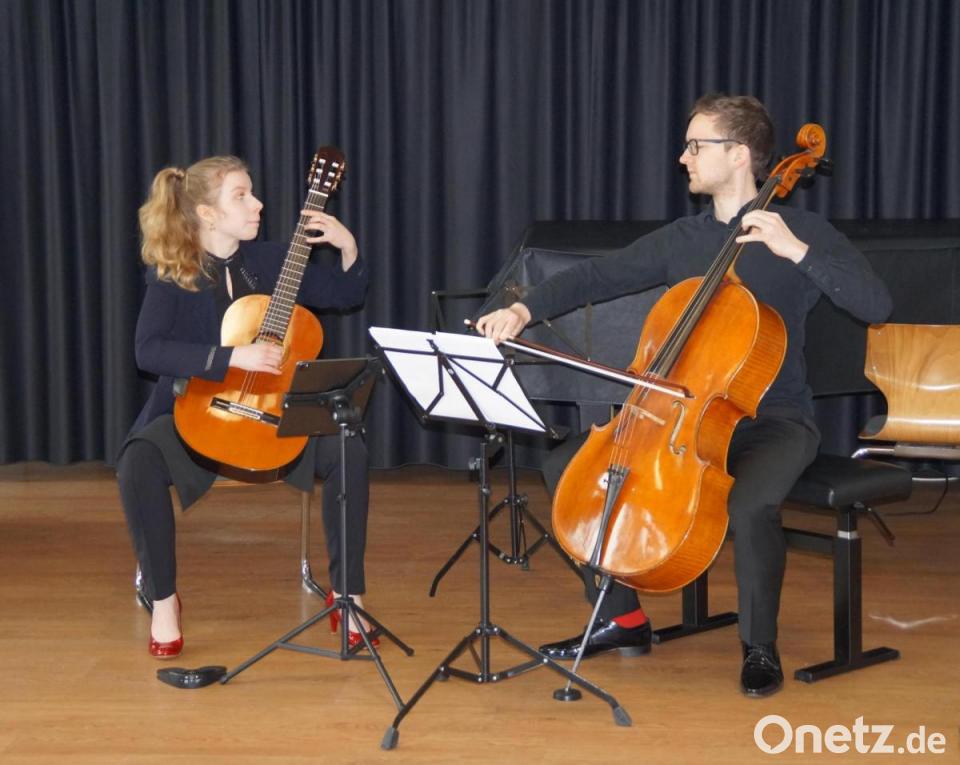 Peter Eckstein freute sich über viele Gäste der "Freunde der Kunst" , die die Matinee im Musiksaal des Ortenburg-Gymnasiums genossen. Laura Lootens (Gitarre) und Konstantin Bruns (Violoncello) beherrschen ihre Instrumente meisterhaft, was ihnen schon viele Preise eingebracht hat.