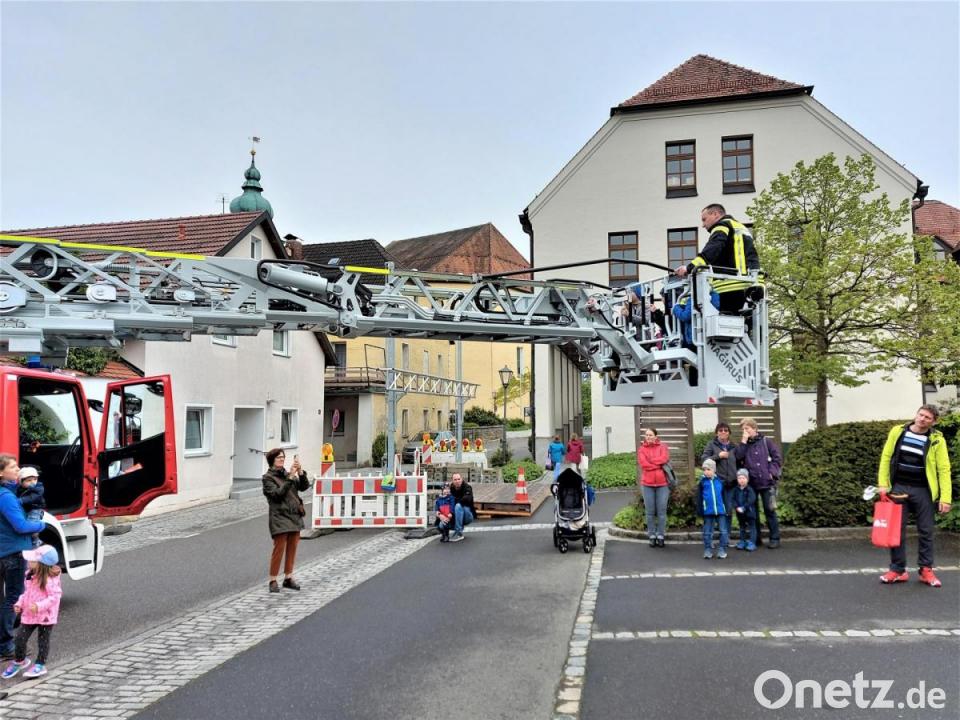 Bibliotheksleiterin Renate Stigler hat für den Abschluss der Lesung die Besichtigung eines echten Feuerwehrautos auf dem Platz hinter dem Rathaus angekündigt. Groß war aber die Überraschung bei den Kindern, als dort die neue ausfahrbare Drehleiter mit dem Korb an der Spitze angefahren war. Der Oberviechtacher Feuerwehrkommandant Ferdinand Roßmann und Feuerwehrmann Adrian Goerke luden die kleinen Besucher nicht nur zur Besichtigung des imposanten Fahrzeugs ein. Wer wollte, konnte sogar im Korb hochfahren und die Altstadt von oben bestaunen. „Ich hab mich getraut, das war super“, freute sich ein junger Fahrgast über das Erlebnis, als der Kommandant den Korb wieder behutsam am Boden aufgesetzt hatte.
