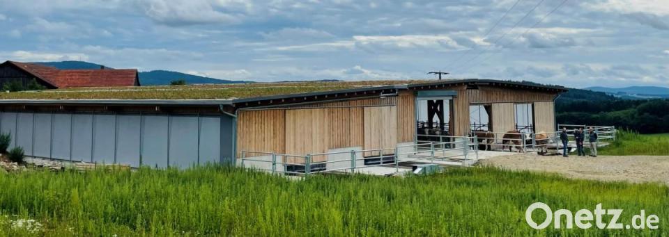 Die ansehnliche Holzkonstruktion des Stalles schmiegt sich mit seiner flachen Anlage und dem bepflanzten Gründach in die strukturreiche Kulturlandschaft des Vorderen Oberpfälzer Waldes. Am Horizont können dort die derzeit 52 Milchkühe den Wald sehen, aus dem das Holz, rund 300 Festmeter, stammt, das nun ihr neues Zuhause bildet. Sie haben den Stall gut angenommen. Das ist das Wichtigste für die Albangs: „Wir wollen ja in erster Linie, dass es der Kuh gut geht.“ Sie hatten lange überlegt, wie sie ihren Stall bauen sollten, bis Johann Albang auf Youtube einen Film über ein besonderes Modell entdeckt hat. Ihm war gleich klar: „Der gefällt mir.“ Er war nach dem „System Grub“, einem Modulbausystem, das die bayerische Landesanstalt für Landwirtschaft entwickelt hat, errichtet worden. Es will Landwirten durch Eigenleistungen möglich machen, Kosten zwischen 25 und 40 Prozent einzusparen. Für die Albangs, die grundsätzlich einen äußerlich ansprechenden Stall aus eigenem Holz errichten wollten, ein Glücksfall.