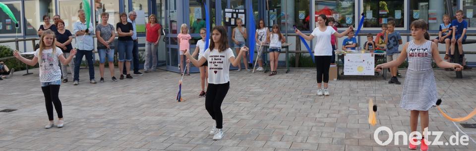 Rektor Winderl bedankte sich beim Elternbeirat, der wieder für Grillspezialtitäten und Getränke sorgte. Auch Butter, die im Butterfass ausgerührt wurde und der von Gerlinde Lohrer hergestellte Käse befanden sich im Angebot. Ein weiterer Dank galt der SMV unter der Führung von Jürgen Dietl, die wie jedes Jahr eine Tombola mit vielen tollen Preisen organisiert hatte. Die Bläsergruppe unter der Leitung von Christian Knott eröffnete das Schulfest im Pausenhof der Mittelschule bei herrlichem Wetter. Dann übernahm die Band "Voice & Chords", die schon im vergangenen Jahr für die Mittelschule auf der Burg Obermurach ein Benefizkonzert für den Förderverein gegeben hatte, die musikalische Unterhaltung der vielen Gäste. Eine Poi-Show der Klasse 5c-G sowie eine Einlage des Ovi-Tanztheaters wurden auf der Aktionsfläche aufgeführt. Auch der Kolping-Spielmannszug, der ja sein Quartier in ehemaligen Schulräumen hat, unterhielt die Gäste. In der Pausenhalle der Mittelschule konnten ein Einsatztraining der Bundespolizei verfolgt und Trainingsgegenstände ausprobiert werden.