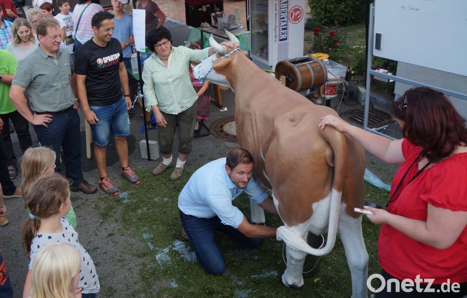 Eine "gewichtige" Attraktion stellte Kuh "Edda" dar. Neben vielen Gästen versuchten sich mit viel Geschick auch zweite Bürgermeisterin Christa Zapf und Ehrenbürger Ludwig Berger beim Melken. Sieger beim Melkwettbewerb zwischen Lehrer und Elternbeirat wurden die Eltern. Selbst Initiatorin und "Profi" Gerlinde Lohrer konnte die Niederlage der Lehrer nicht verhindern. Das Schulfest kann wieder als großartige Gemeinschaftsleistung gewertet werden.