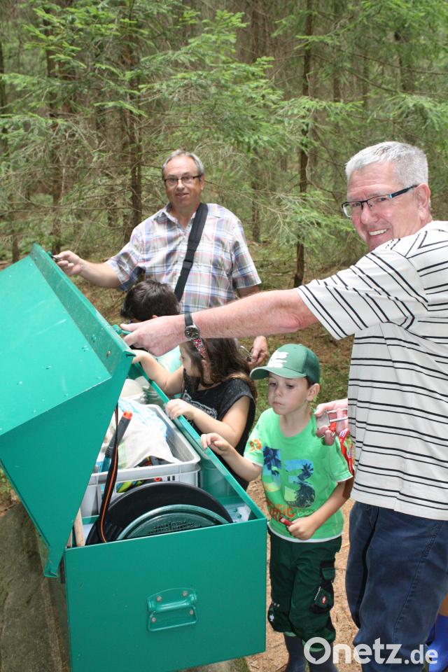 Die letztgenannte Technik durften die Goldwäscher im Stadtwald beim Haus Gütting anwenden. Dorthin wanderte die Gruppe von der Info-Station bei Unterlangau aus zu Fuß. Der Forellenbach, wo schon vor Jahrhunderten die Goldwäscher aktiv waren, bietet ideale Bedingungen. Zuerst mussten aber alle mit den nötigen Handwerksutensilien wie Schaufel, Sieb, Eimer und Waschpfanne ausgestattet werden. Die beiden Goldführer öffneten hierzu die Bügelschlösser des geheimnisvollen "Schneewittchensargs", wie sie den auf einem Felsen montierten Metall-Container unmittelbar im Abbaugebiet nennen.