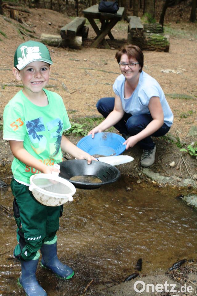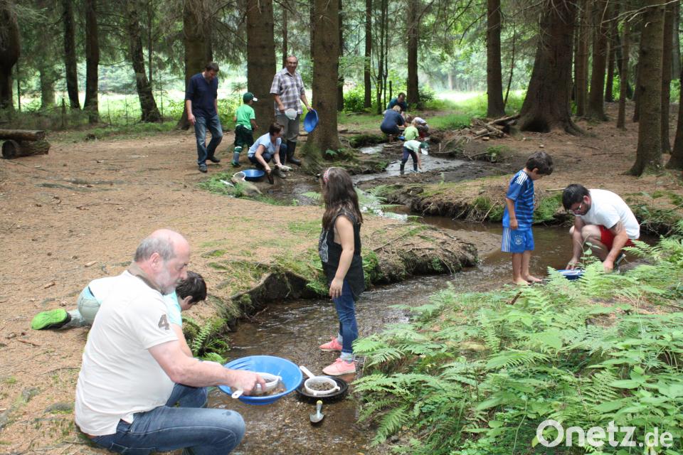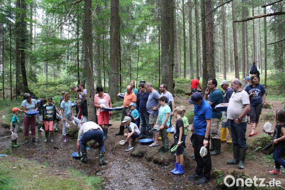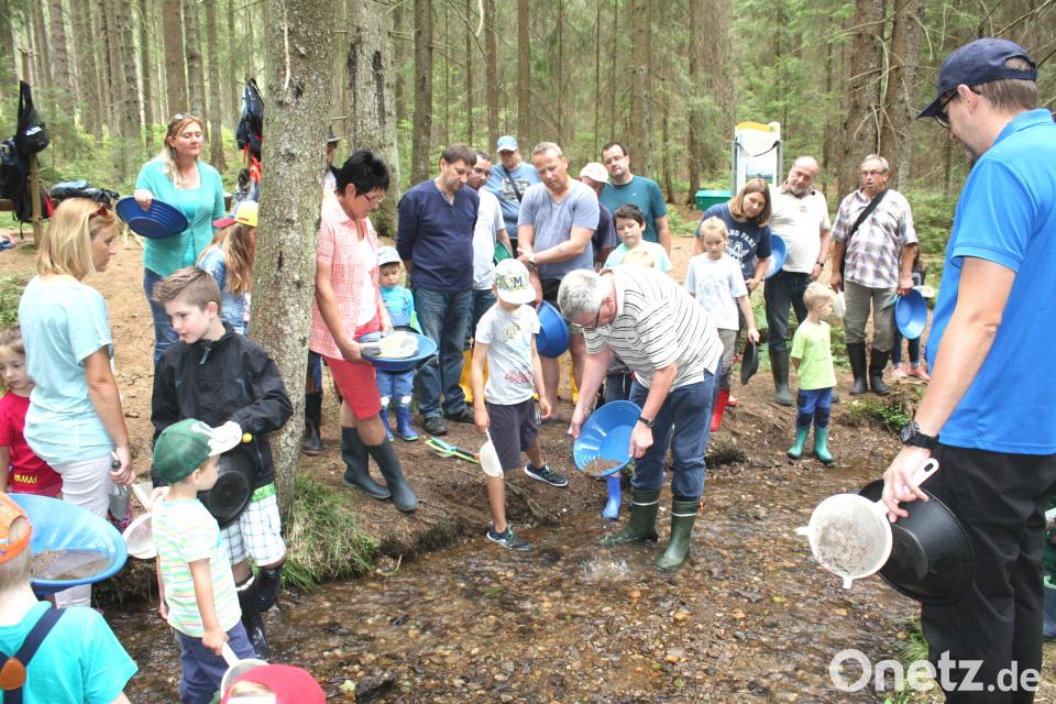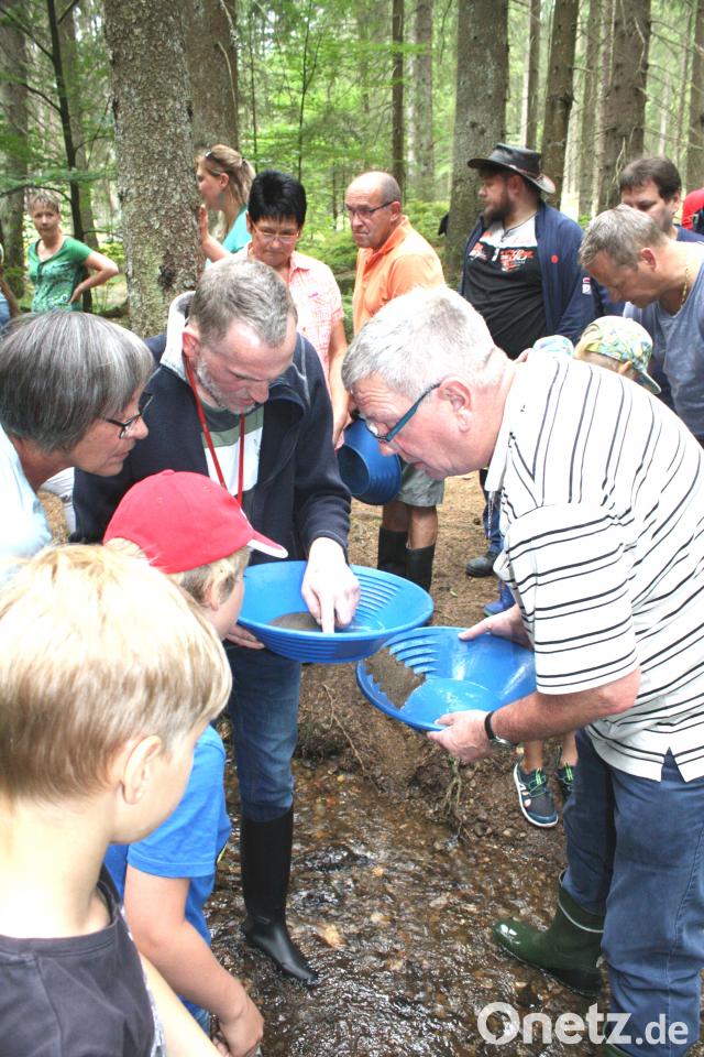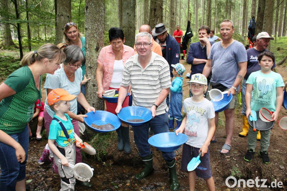 47 Goldwäscher schwenkten am Forellenbach in der Langau ihre Waschpfannen, um aus Gestein und Sand ein Fünkchen "goldenes Glück" herauszufiltern. Die Teilnehmer der jüngsten Goldwanderung - meist Familien mit Kindern - kamen aus Amberg, Sulzbach-Rosenberg, Wernberg und Schwarzenfeld, aber auch Feriengäste aus Rheinland-Pfalz und Schleswig-Holstein waren mit von der Partie.