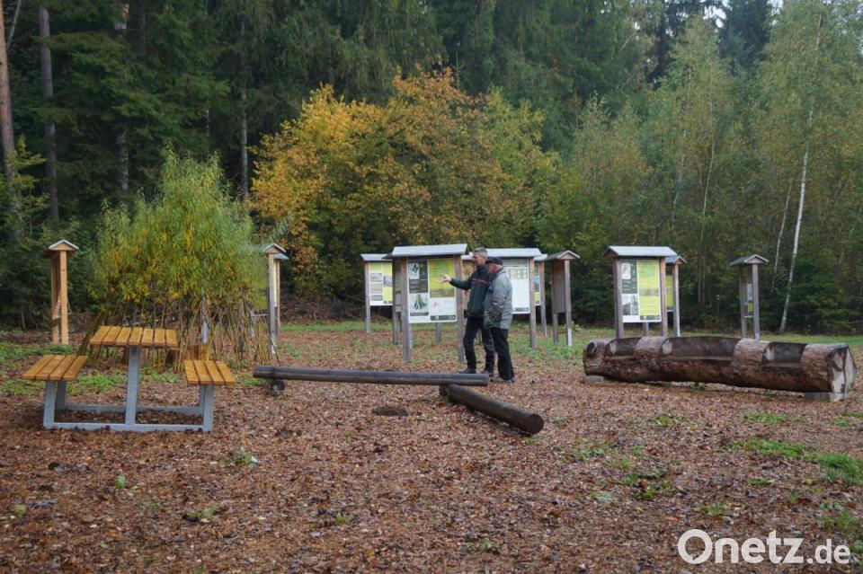 Zur Übergabe des Klangspiels testete der Bürgermeister die unterschiedlichen Klänge der Holzbohlen durch Anschlagen mit dem Holzhammer. Die unterschiedliche Länge der Holzkörper, die aus Lärchenholz gefertigt wurden, ergibt auch verschiedene Töne. "Das Klangspiel war auch für die Oberviechtacher Werkstätten, die die Fertigung übernommen hatten, ein Pilotprojekt", betonte der Bürgermeister. Die Rahmen der zwölf Schautafeln in dem Pavillon, die über Alternativen zum Waldumbau informieren und Bäume vorstellen, die sich für den Klimawandel besser eignen, sind ebenfalls in den Werkstätten gefertigt worden. "Wir haben sehr viel Wert auf Naturmaterialien gelegt, fast alles ist aus Holz und natürlichen Materialien", so Forstdirektor Lobinger.
