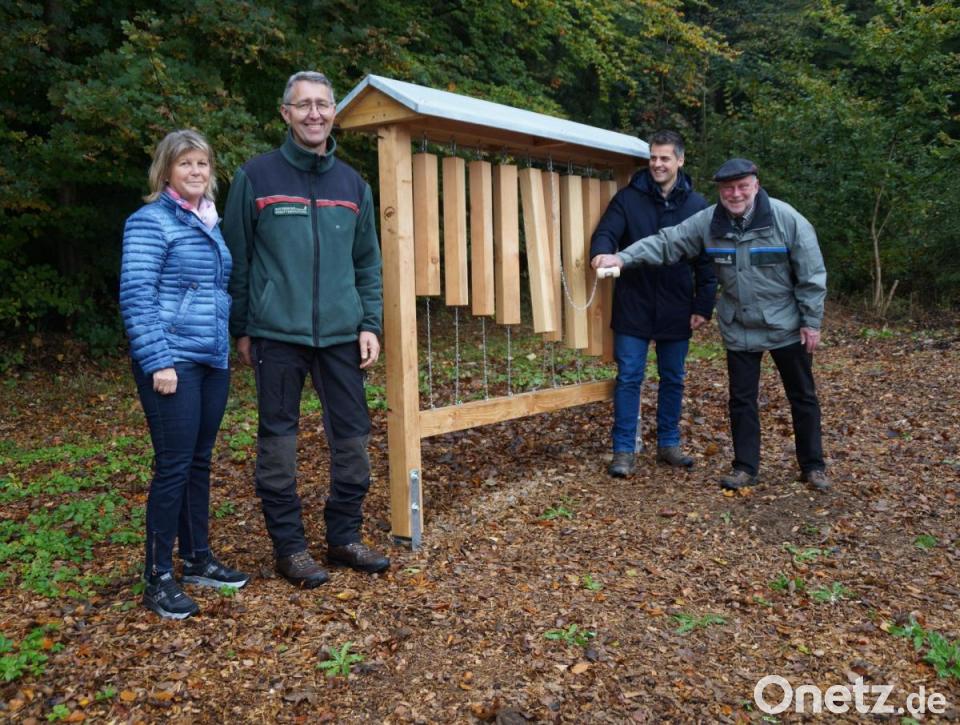 "Das ist ein idealer Ort für Familien, und das Klangspiel ist eine tolle Aufwertung." Damit sprach Bürgermeister Rudolf Teplitzky den Waldumbau-Pavillon bei der Infostelle zum Goldlehrpfad bei Gütting an, der mit einem hölzernen Klangspiel bereichert wurde. Nun wurde es offiziell übergeben.