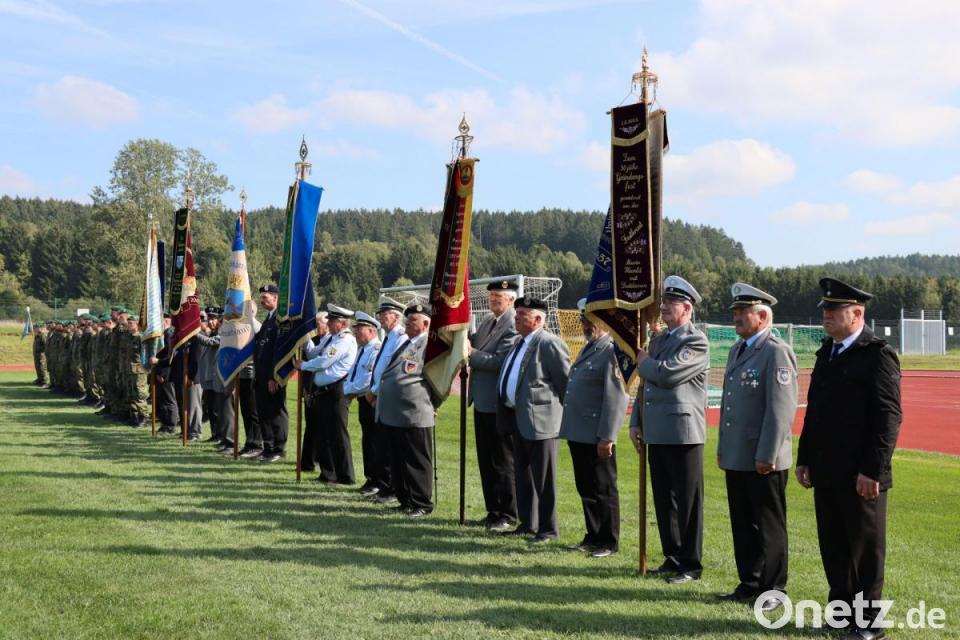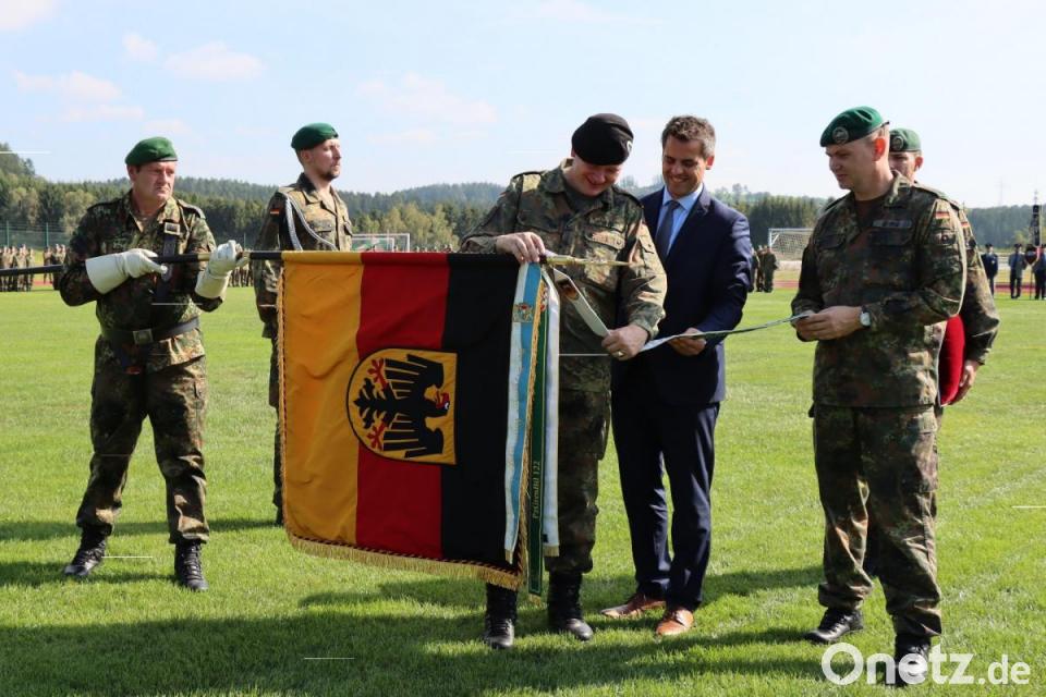 Der Kommandeur der 10. Panzerdivision, Generalmajor von Butler, würdigte in Oberviechtach im Rahmen eines Appells die zahlreichen Einsätze des Panzergrenadierbataillons 122 durch die Verleihung des Fahnenbandes „Einsatz“.
