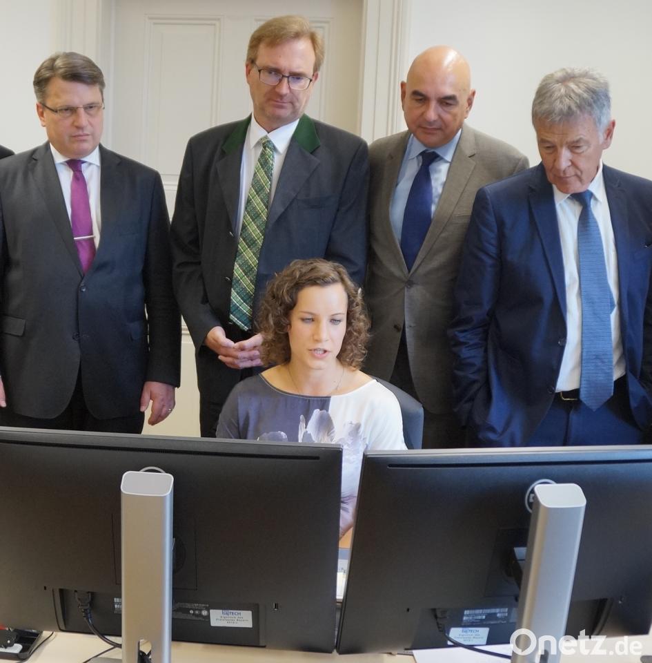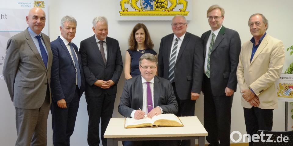 Da kann eine Seite schon mal eine Stunde "Übersetzungsarbeit" kosten. Durch Mitarbeiter, die mit "Herzblut und Kampfgeist" an die Sache herangehen, sind bereits 14.982 Grundbuchblätter umgeschrieben und digital erfasst worden. Nach dem Eintrag ins "Goldene Buch" der Stadt schauten die Gäste Rechtspflegerinspektorin Anna Nagler über die Schulter, die die teilweise schwierige Arbeit mit alten Grundbucheinträgen erläuterte. Baudirektor Roman Beer vom Staatlichen Bauamt Amberg-Sulzbach erläuterte die Herausforderungen der "interessanten Baustelle", die mit dem Amt für Denkmalschutz abgesprochen wurden.