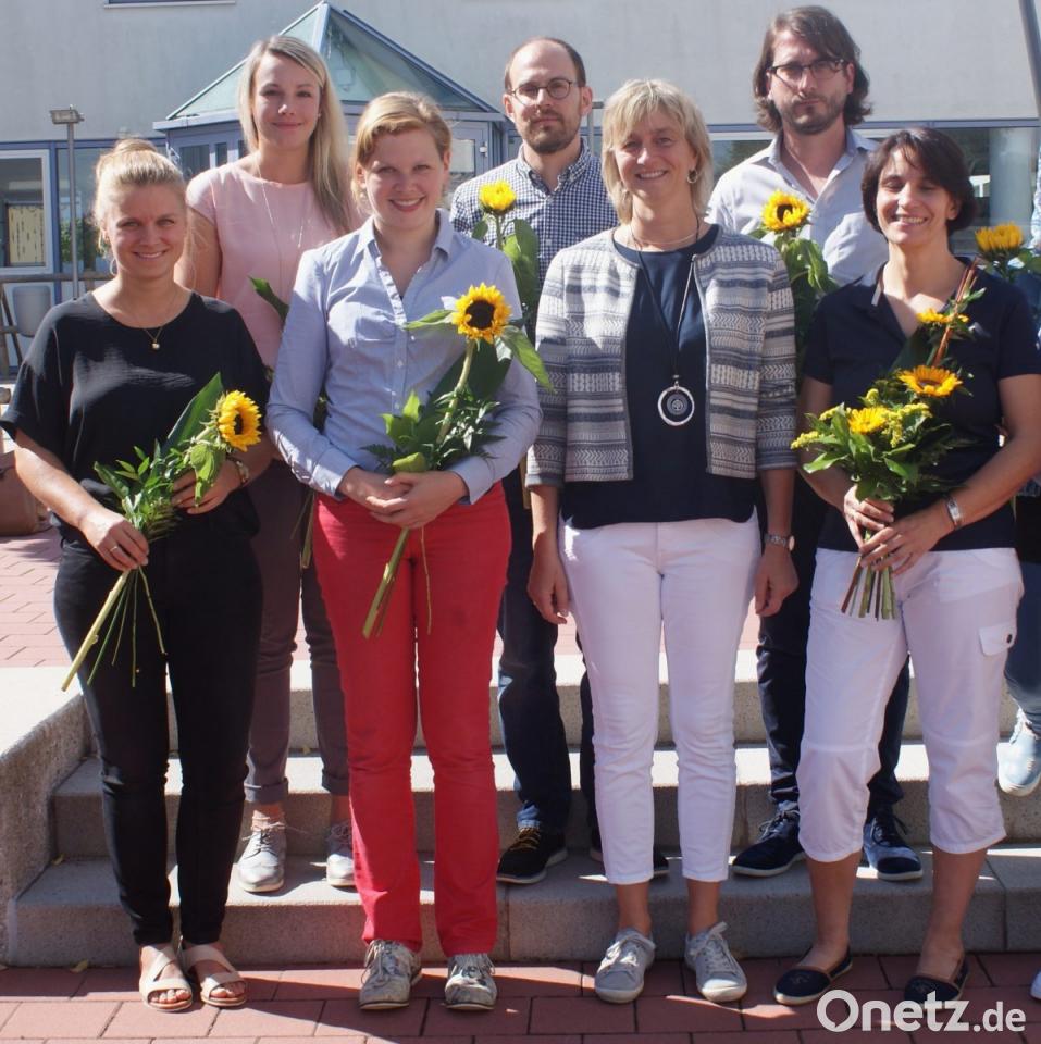 Rektorin Beate Vetterl (Dritte von rechts) freut sich, mit Konrektorin Christine Losch (rechts) Verstärkung in der Schulleitung zu haben. Auch die neuen Kolleginnen und Kollegen (von links) Pia Liegl, Miriam Spannagl, Isabelle Lehmann, Alexander Karrasch und Peter Grosser wurden herzlich empfangen.