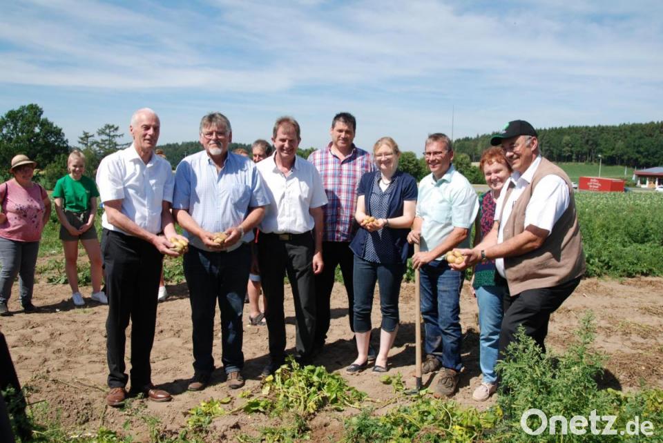 "Es schaut gut aus", meinte Reinhard Elsner, als er am Dienstag den Kreil durch den Ackerboden gleiten ließ und ausreichend viele Knollen der frühen Sorte "Valetta" zum Vorschein kamen. Beobachtet wurde er dabei nicht nur von BBV-Geschäftsführer Josef Wittmann. Zunächst am Betrieb in Hof und anschließend am Feld fand sich eine Reihe von Gästen ein, welche BBV-Kreisobmann Josef Irlbacher begrüßte. Von den rund 300 Kartoffelbauern im Landkreis werden rund 1060 Hektar (14 Hektar in Oberviechtach) angebaut. Im nassen Jahr 2017 waren die Kartoffeln teilweise zu groß, im Hitzesommer 2018 oft zu klein. Auch die Hersteller von Chips (Lorenz Neunburg) und Kartoffelteig (Burgis in Neumarkt), die für die Bauern im Landkreis die größten Abnehmer sind, stellen Anforderungen an die Knolle. "Die beiden Großabnehmer tragen dazu bei, dass sich der Kartoffelanbau bei uns gut halten kann", meinte Irlbacher und ergänzte: "Wir hoffen, dass wir den Auftrag der Gesellschaft erfüllen können und heuer eine gute Ernte einfahren."