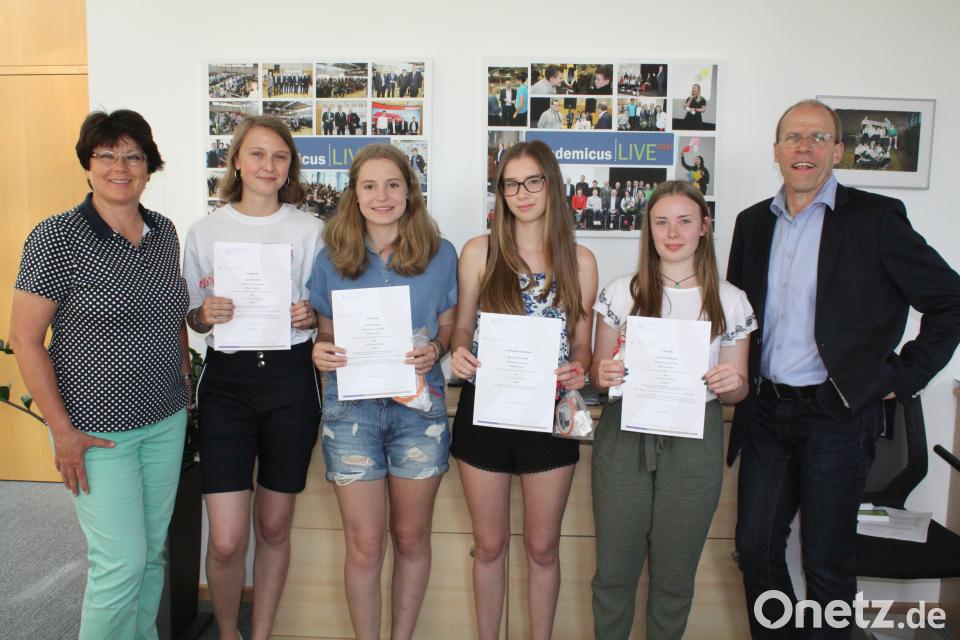 Gymnasiastin Lena Rückerl (zweiter Landespreis) sowie Leonie Reng, Pauline Mösbauer und Melanie Schnell erhielten jetzt aus der Hand von Schulleiter Ludwig Pfeiffer die Urkunden bzw. Büchergutscheine ausgehändigt. Für Lena Rückerl hatte Fachbetreuerin Monika Krauß eine besonders erfreuliche Nachricht parat: Die Schülerin darf zur Landes-Siegerehrung nach Dachau fahren und erhält außerdem einen Geldpreis überreicht.