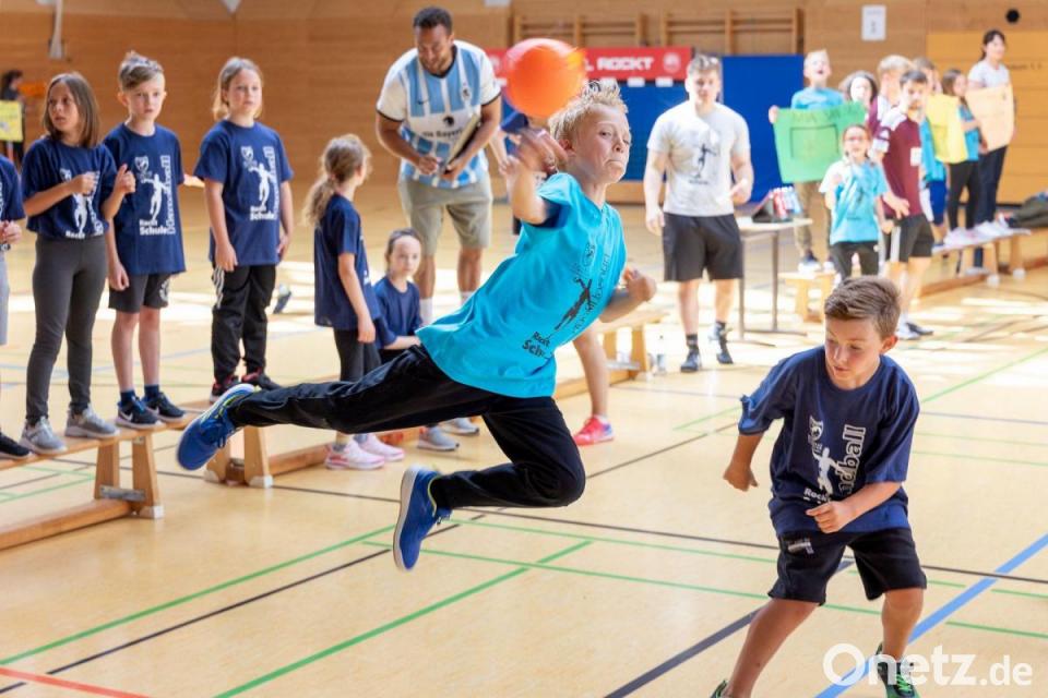 Das Projekt-Seminar „Handball rockt Schule“ des Ortenburg-Gymnasiums unter der Leitung von Oberstudienrat Michael Teplitzky organisierte in der OGO-Halle das Handball-Grundschulturnier für alle dritten Klassen der umliegenden Grundschulen. Seit Wochen arbeiteten die Schüler des OGO für dieses Turnier. In ihre Planungen flossen die Erfahrungen aus „Handball rockt Schule“ der vierten Klassen ein: Neben den Trainingseinheiten, wo sie zum Teil in Eigenregie oder als Unterstützer der Übungsleiter des Handballvereins Oberviechtach 02 den Schülern die Grundzüge des Handballs vermittelten, erstellten sie den Spielplan, backten Kuchen oder organisierten sich in Kleingruppen, die die verschiedenen Arbeiten des Turniertages erledigten.
