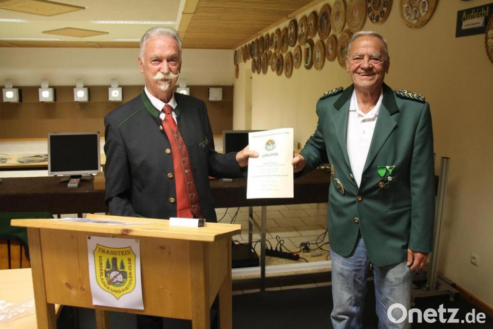 Aufgrund seiner Verdienste um das Deutsche und Oberpfälzer Schützenwesen wurde Gauschützenmeister Manfred Muck vom Präsidenten des Oberpfälzer Schützenbundes (OSB), Franz Brunner, geehrt. Seit 1997 gehört Manfred Muck zu den Aktivposten im OSB.
