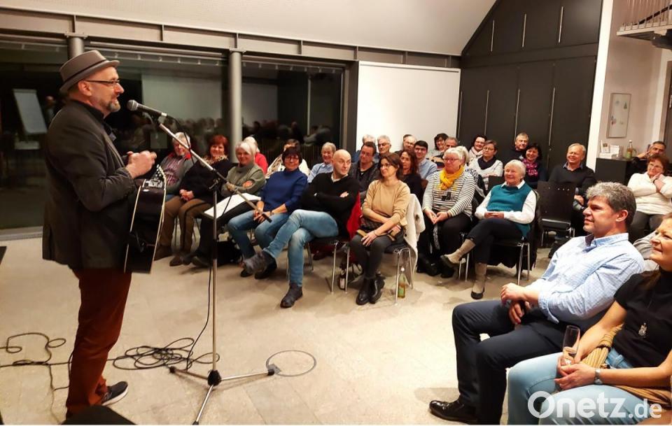„Ich bin meine eigene Vorband“, lautete sein Kommentar, als er mit einem rockigen Gitarrenstück den Abend eröffnete. Dieser sei nach eigenem Bekunden nur dazu da, sein 2023 herausgekommenes neuestes Mundart-Buch an den Mann und die Frau zu bringen. Für 38 Euro pries er zu Beginn dieses Werk an, am Ende des abendfüllenden Programms ging das Büchlein mit dem Titel „Kanapee“ dann für 14 Euro über die Theke.