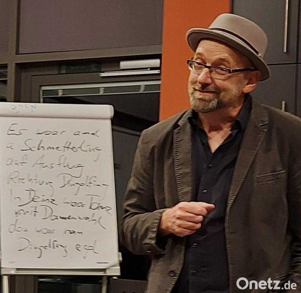 „Ihr wolltet eine Lesung, ihr kriegt eine Lesung“, drohte der Mundartdichter und präsentierte eine hochgestochene Gedichtparodie im astreinen Hochdeutsch, wie sie ein Klassiker nicht besser hätte zu Papier bringen können. Das Publikum solle froh sein, dass im „Kanapee“ nur kurze Mundart-Gedichte verabreicht würden. Bei Produkten dieser Art durften sich die Besucher anschließend bei einem immer wieder eingeschobenen kurzweiligen Workshop selbst beteiligen und sich mit der phantasievollen Wortakrobatik des Künstlers messen. „Es gfreit mi, dass ihr so mitmachts“, lobte Treml seine Besucher und sammelte eifrig die zugeworfenen Reimwörter auf einer Flipchart, wo dann am Schluss ein gefragter „Tanz mit Damenwahl in Deinz“ herauskam. Die Hommage an den Teunzer Frauenbund war unverkennbar. Die aktuellen Bauernproteste lieferten Stoff für ein weiteres Gedicht.