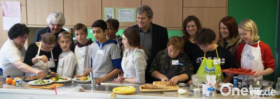 Am ersten von drei kulinarischen Nachmittagen wurden zunächst gemeinsam Karotten geschält, Auberginen gewürfelt, Nüsse entkernt und Schnittlauchröllchen geschnitten. So entstand ein leckeres Menü mit Karotten-Orangen-Suppe, Ziegenfrischkäse mit Honig im Knuspermantel, Tagliatelle mit Ratatouille, Auberginenröllchen mit Spinat und Feta und als Nachtisch Apfel-Quark-Auflauf. Bei der anschließenden Verkostung zeigten sich Projektleiterin Gerlinde Lohrer, Rektor Werner Winderl und Konrektor Rudi Schneider voll des Lobes. Auch die Vertreterinnen des Amtes für Ernährung, Landwirtschaft und Forsten (AELF), Daniela Groß und Christina Apel, genossen die leckeren, vegetarischen und hübsch angerichteten Speisen. Und die Schüler haben fast alle ihre Teller leer gegessen.